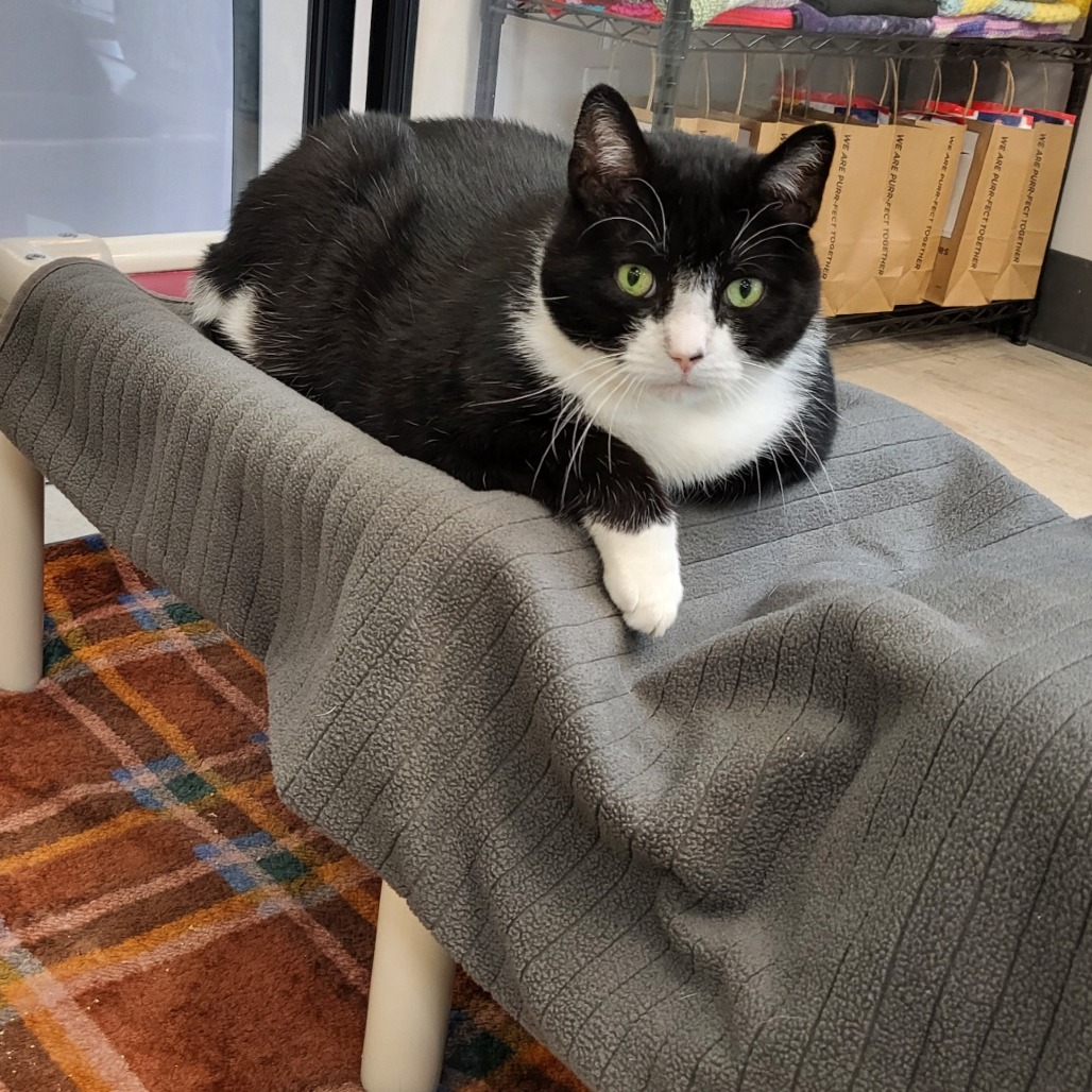 Wowza—20 pounds of pure tuxedo charm! Maverick is an 8-year-old gentle giant with a heart as big as his body. This dashing senior will prefer a peaceful home where he can reign as the one and only furry royalty. He’s a master of the flop-and-roll, showing off just how cute he can be, and he adores soft brushings, gentle cheek scritches, and sweet conversations with his favorite humans. While he enjoys a bit of independence, Maverick is always happy to soak up the spotlight. If you’re looking for a big boy with an even bigger personality, Maverick’s ready to steal your heart (and your couch. He might need assistance getting up there though).