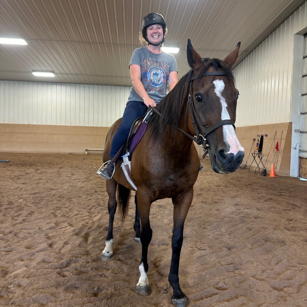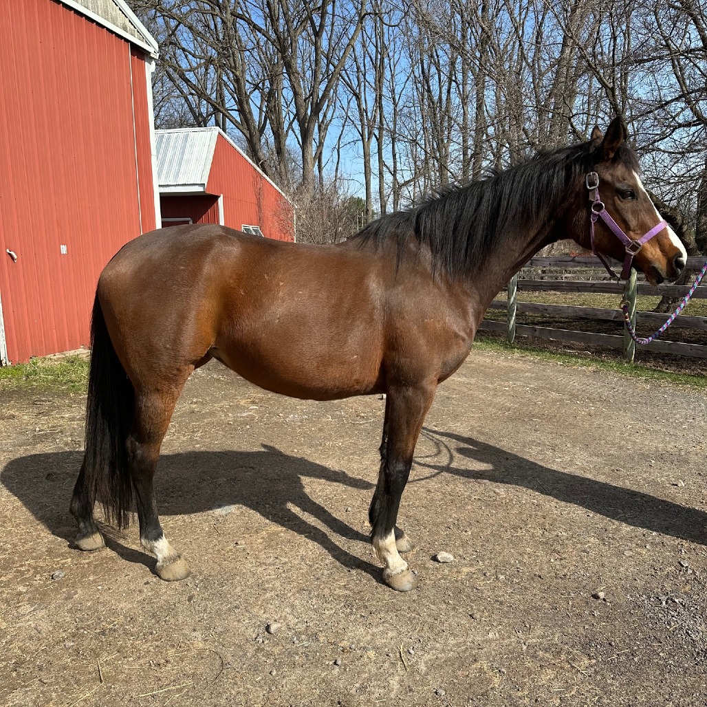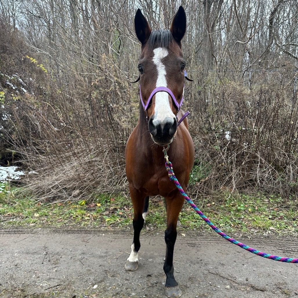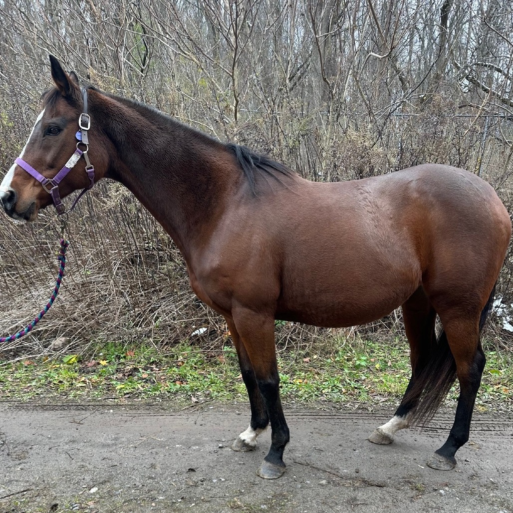 This sweet little lady is Lindsay - 15hh bay TB mare. She has all the personality traits you would want in a mare; sweet, intelligent, and attention loving. Lindsay has excellent manners, trailers well, ties, stands for vet and farrier, and gets along great with other horses. She came to us with no vision in her left eye, but it doesn't affect her in the day to day. We know she is a thoroughbred that did not race, but for a number of years prior to coming to Lollypop Farm, she had just been loved on as a pasture pal. Currently being ridden walk/trot in the arena, this mare is green and has a motor, so she will require an experienced rider. She struggles tracking left, which may be due to her vision but we can’t be sure. She doesn’t seem spooky and loves to go – we could see her doing well as a trail horse with a friend nearby or on her blind side. Lindsay did great being ridden on our farm walk recently, now that we've finally got the weather to do so! Even though she is rideable, we believe she would be perfectly happy continuing that pasture pal life. Lindsay would make a great companion to you or your equine friend. She has done well with both mares and geldings, and has a quieter comforting nature overall. Suitable for an advanced rider or intermediate rider working with a trainer. With no riding intended, suitable for a beginner and up. Adoption Fee: $1500 Adoption pending, but still accepting applications.