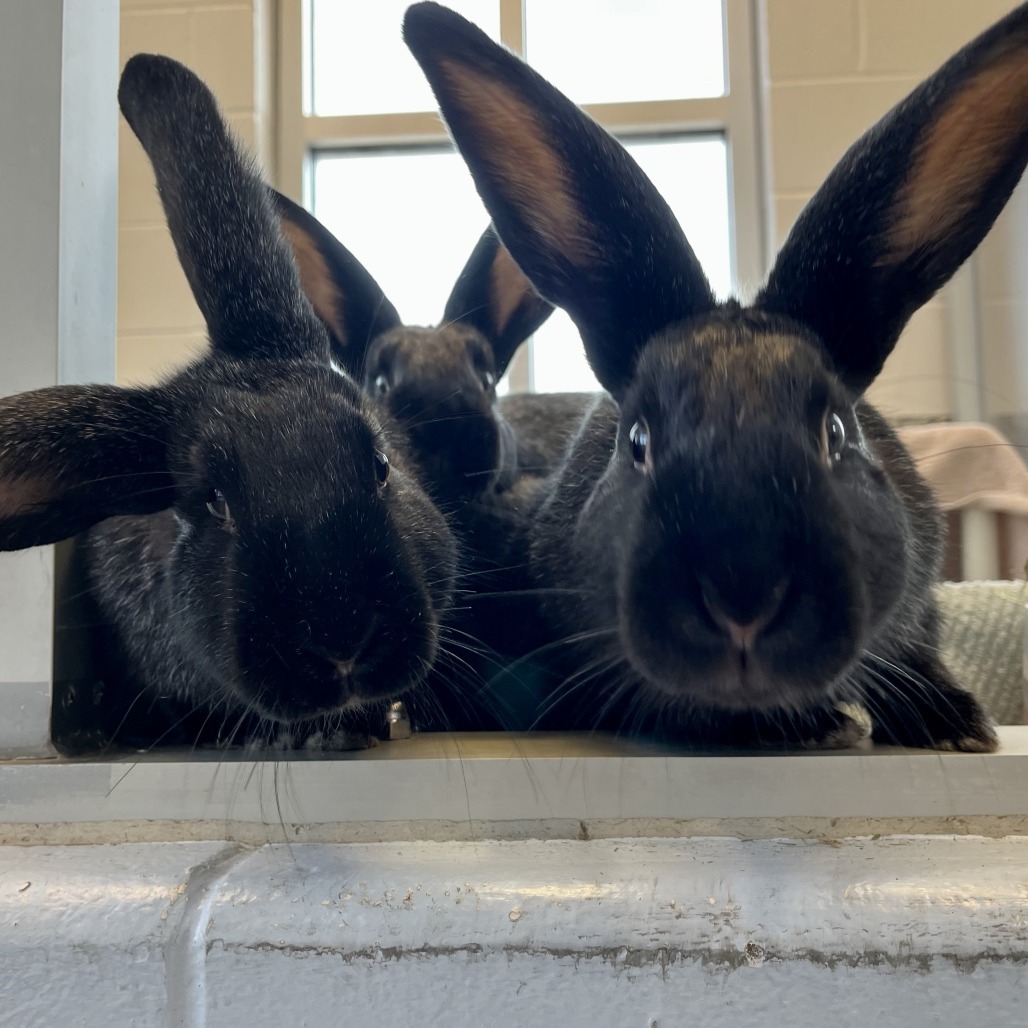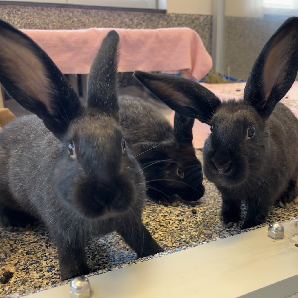 Come say hello to our beautiful trio of bunnies: Ramona, Matilda, and Claudia! These sweet girlies all love each other very much and are a required 3-for-1 adoption. These ladies are a curious young bunch who love to explore, snack, and lounge together. Each one of them gets so excited to say hi whenever someone approaches their enclosure. They are each fun, active, and friendly in their own way, and though we’ve loved getting to know them here in the shelter, it’s time for these friends to find a real place they can call home. Bonding rabbits is not always an easy process, so finding a group that already gets along so well is a great perk. You’ll never have to worry if your bun is lonely when you’re away knowing these girls always have each other for company. How can three not be better than one when each one is so adorable??? If you’re willing to give this terrific trio of triplets a chance, come stop by Lollypop Farm to have your heart stolen x3!
