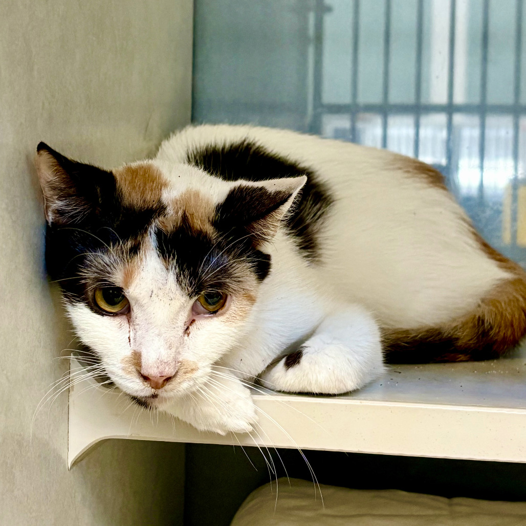 Tina, a shy young calico, dreams of a quiet home where gentle patience blooms. She perches high to watch the world drift softly by, her gaze steady and thoughtful. With most of her teeth gone, she treasures her wet meals all the more, savoring each bite as a gift. Bird videos enchant her, and the sweetness of a song sung just for her brings comfort to her tender heart. With a mellow friend or a kind human by her side, Tina is ready to grow into love, one peaceful moment at a time.