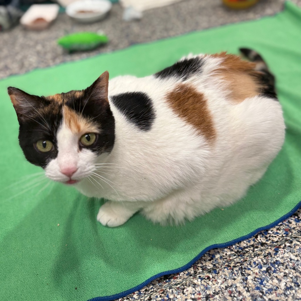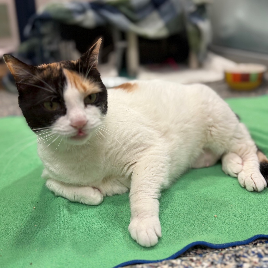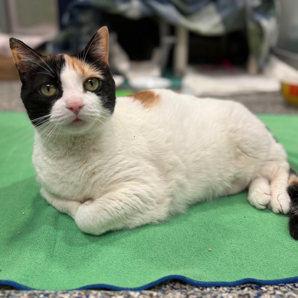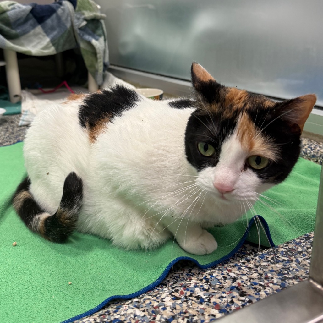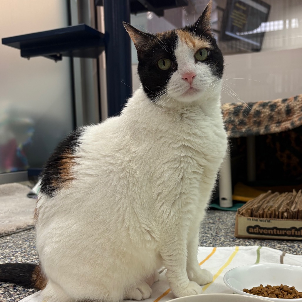 Patches is a grand, mostly white 10-year-old calico whose motto is simple: admire from afar, peasants. This queenly gal prefers life on her own terms—no scritches, no smothering, no nonsense. Instead, she thrives in quiet kingdoms with cozy hideaway realms where she can rule in peace, judging the world between naps and carefully curated bird videos. She’s happiest in a calm, quiet home without children, and she doesn’t enjoy being pushed to warm up on someone else’s timeline. Give her the space, serenity, and respect she deserves, though, and this regal, independent lady will grace your home with her majestic presence—and maybe even the occasional approving glance… if you’re lucky.