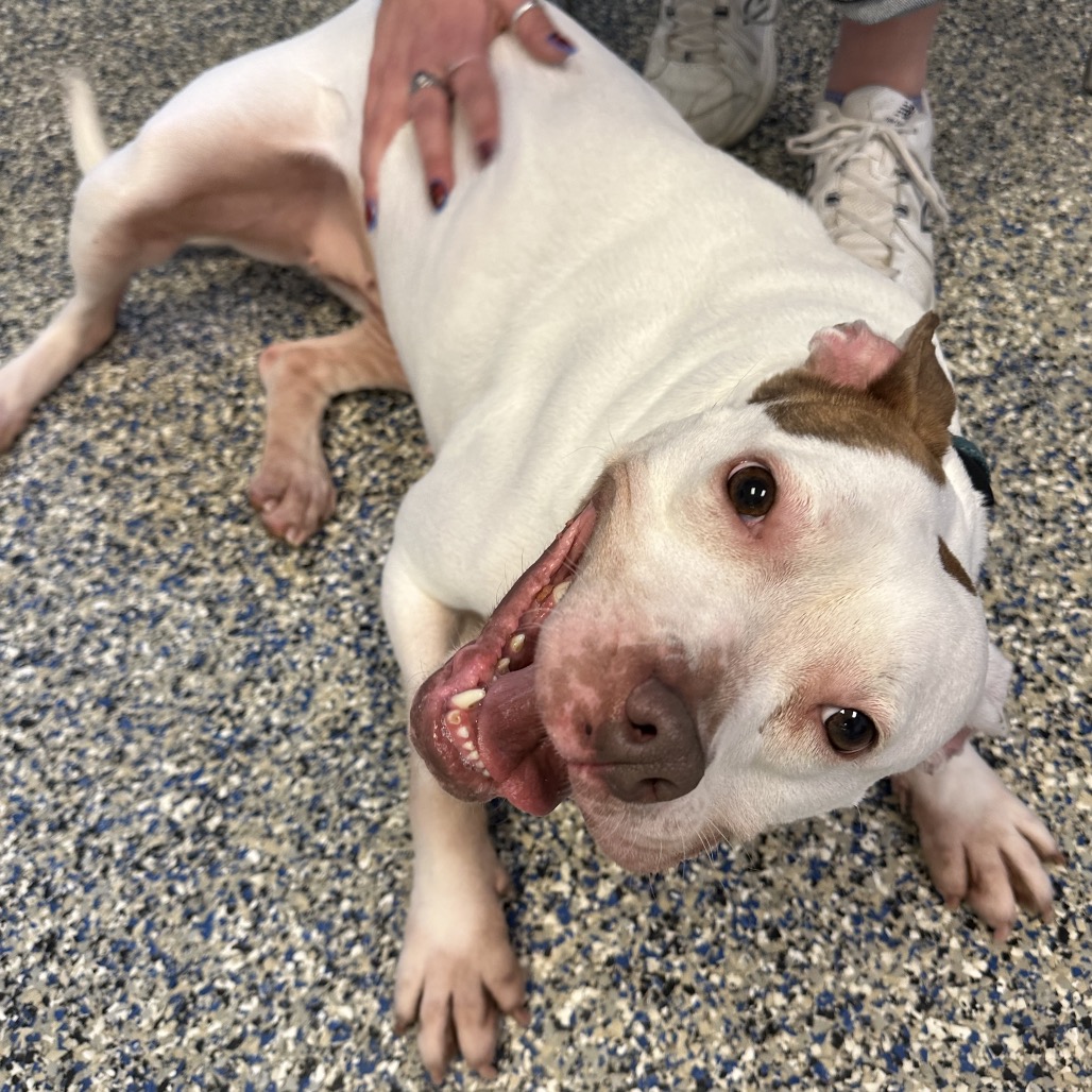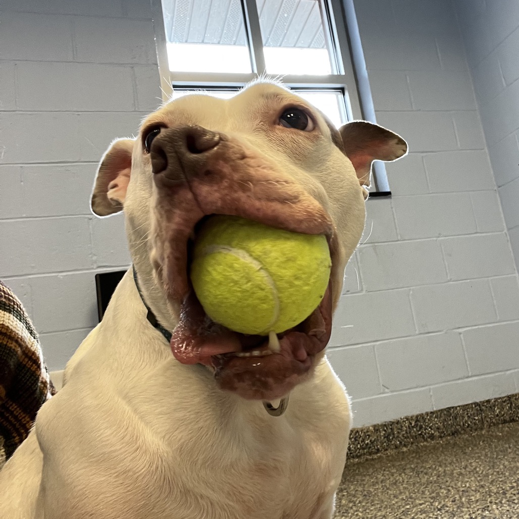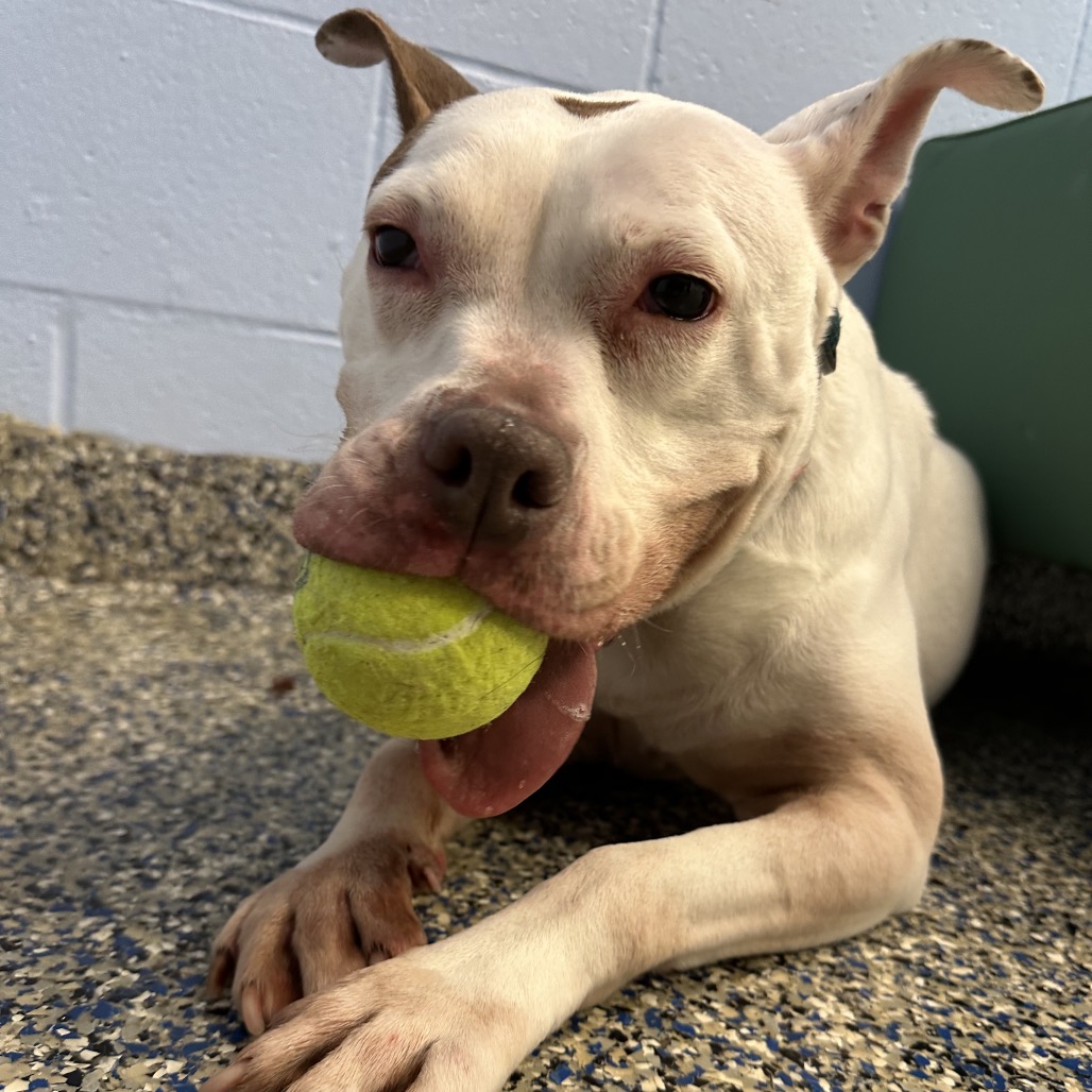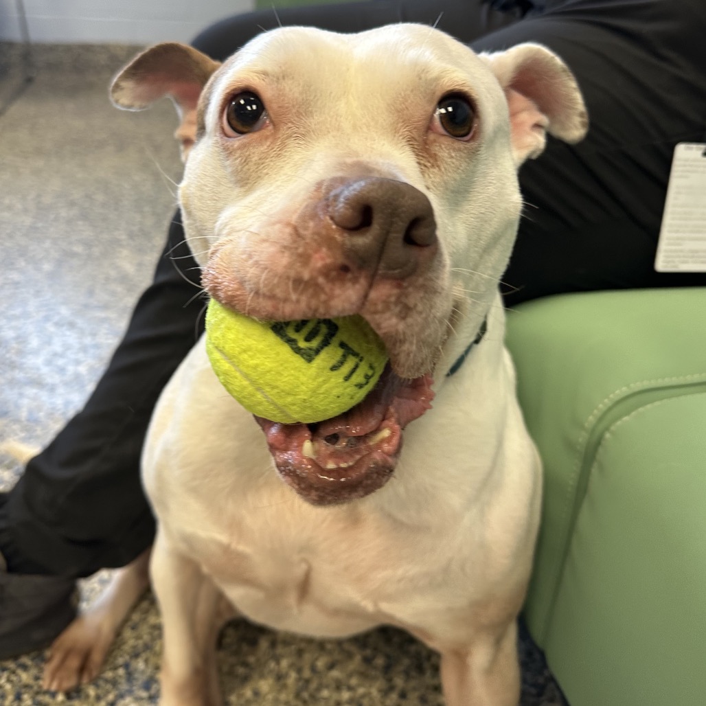 Daisy is a fun-loving girl who’s ready to take on the world! She loves nothing more than rolling onto her belly for pets and playing with tennis balls—she’s absolutely obsessed with them. Daisy will happily keep herself entertained, chasing her tennis balls around the room and soaking up all the love she can get. While we don’t yet know how Daisy does with other dogs, she has lived with cats in a previous home.