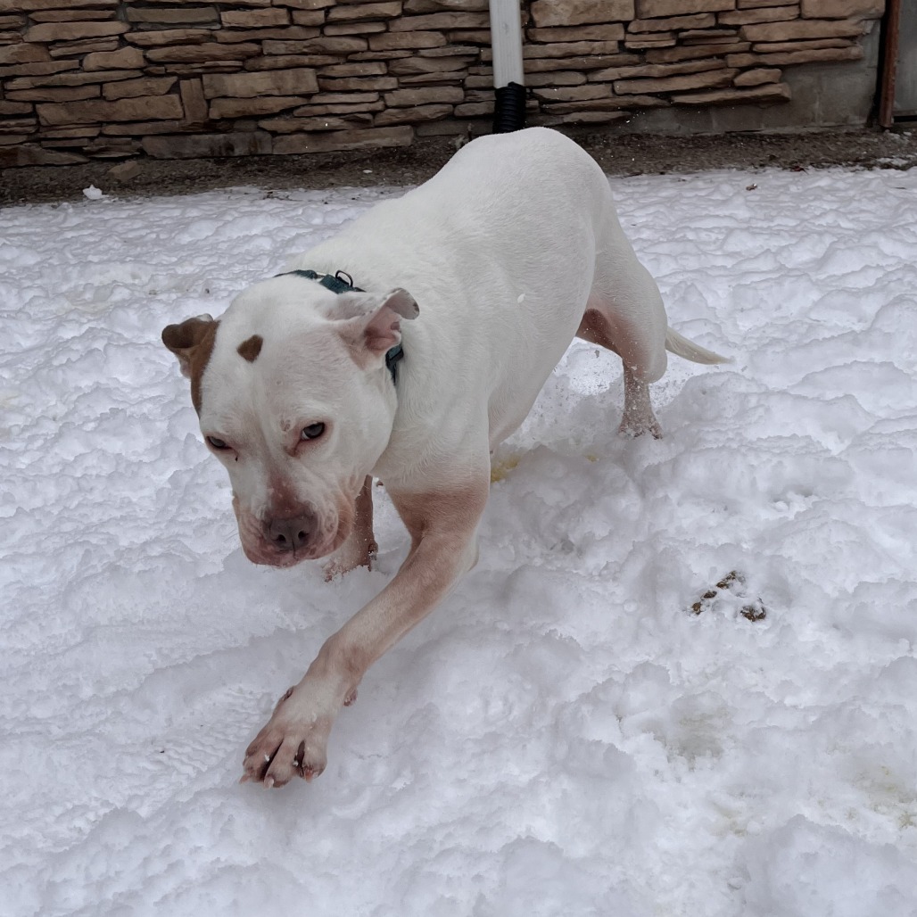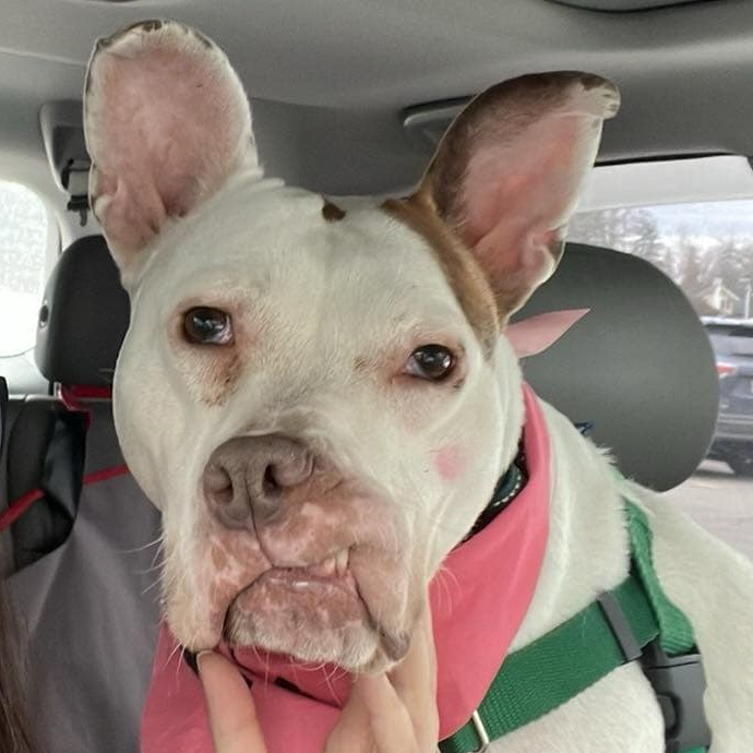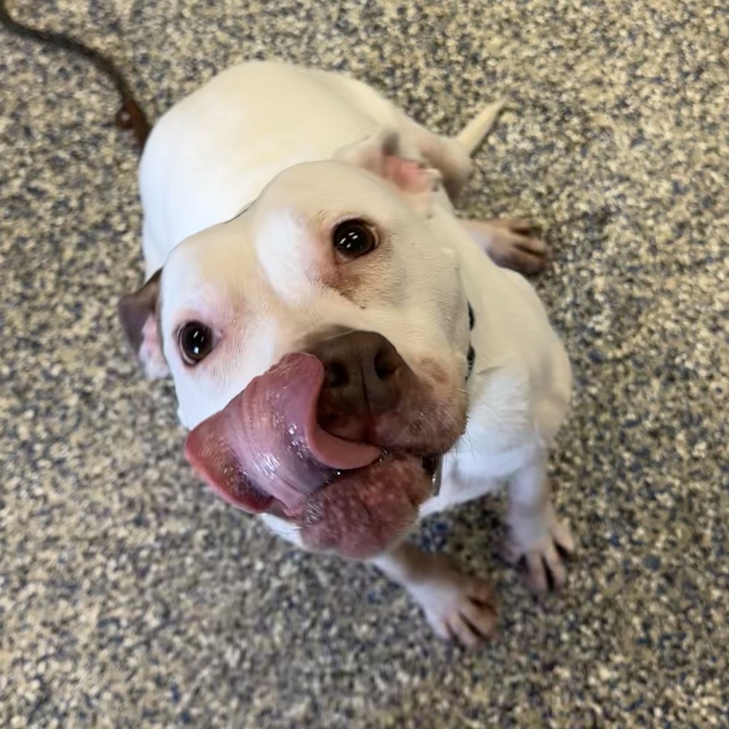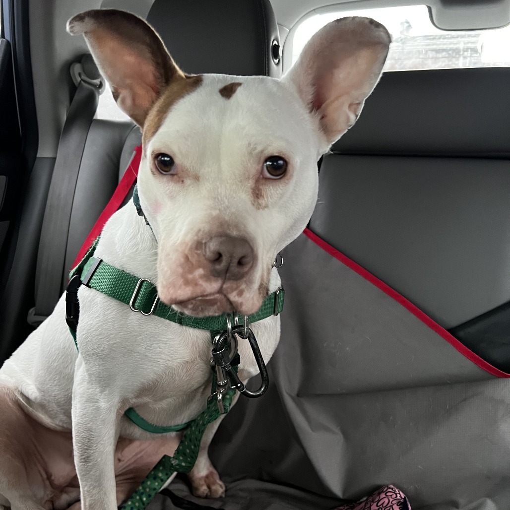 Daisy is a fun-loving girl who’s ready to take on the world! She loves nothing more than rolling onto her belly for pets and playing with tennis balls—she’s absolutely obsessed with them. Daisy will happily keep herself entertained, chasing her tennis balls around the room and soaking up all the love she can get. While we don’t yet know how Daisy does with other dogs, she has lived with cats in a previous home.