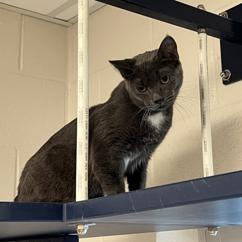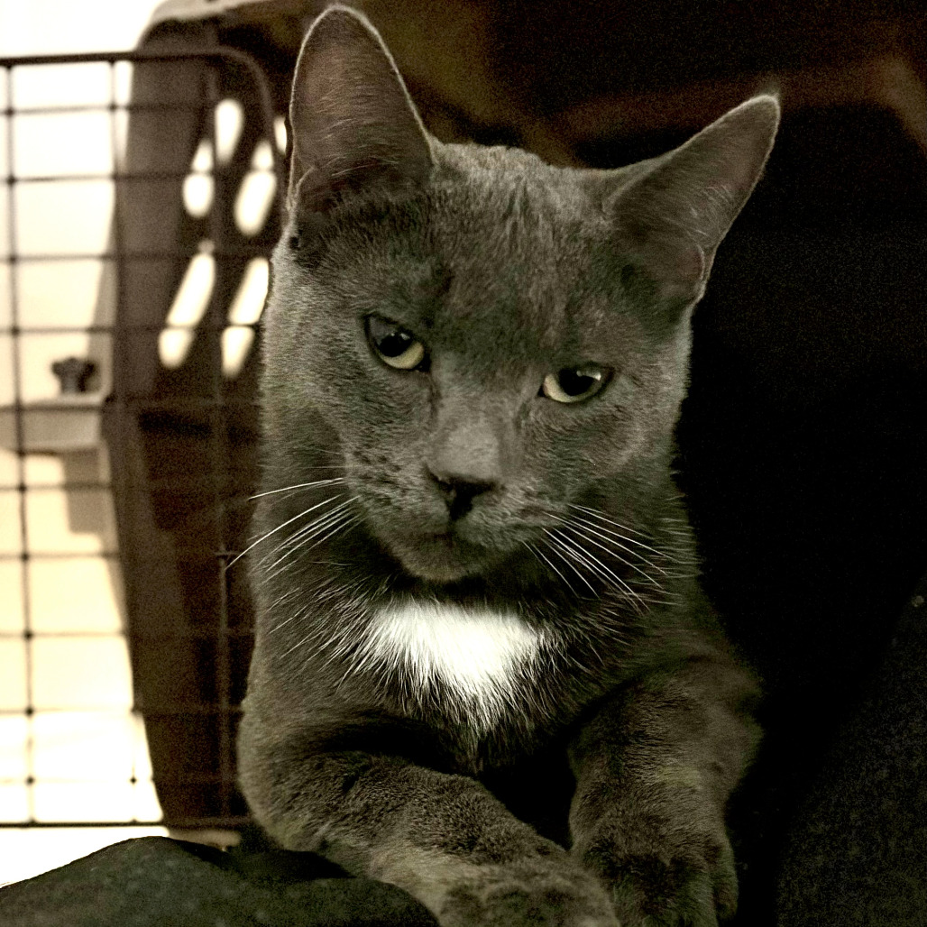 Nutter is a steely grey two-year-old gentleman with a quiet heart and a thoughtful way of moving through the world, shaped by a life once shared with many feline companions. Shy by nature, he takes his time opening up, but in a serene home with a patient person—and ideally a friendly cat companion—he has all the makings of a truly special friend. Nutter will need a cozy “base camp” to begin his journey, a single peaceful room where all his comforts await, from soft beds and cubbies to food, water, litter boxes, toys, and a tall cat tree to watch the world safely from above. He has a healthy appreciation for good meals, enjoys the occasional Churu or Temptations treat, and, when he thinks no one is watching, indulges in joyful catnip rolls. Most at ease alongside other cats or perched high where he feels secure, Nutter is looking for a calm, understanding home where patience and kindness will help him gently unfold into himself.