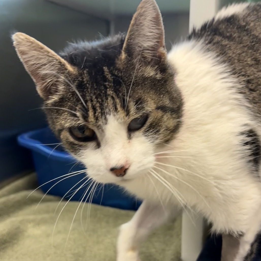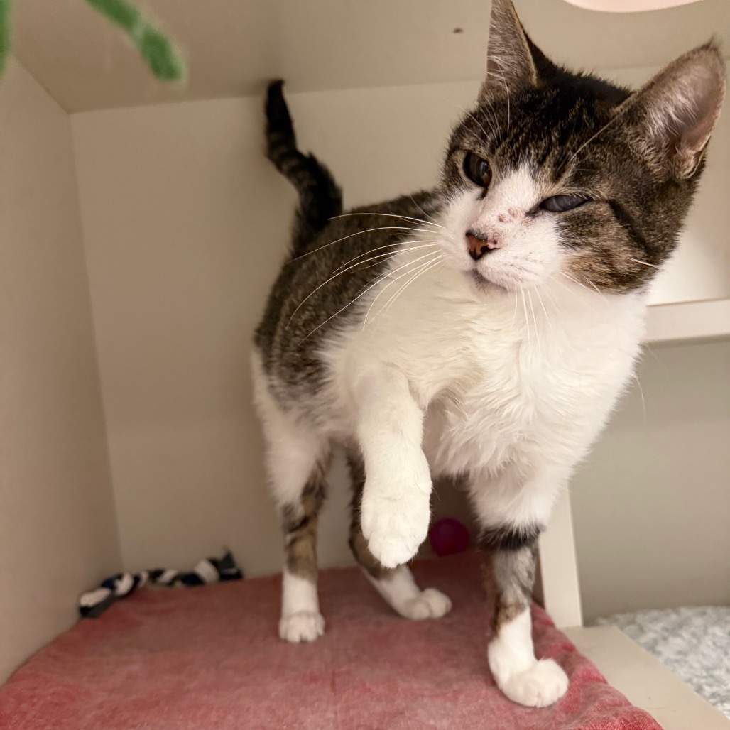 Momma Kitty is a petite ten-year-old white and brown tabby who prefers to watch the world from above, choosing high perches and cat trees as her favorite places to rest and reflect. A mellow soul at heart, she enjoys gentle head scritches in small, perfect doses and then settles back into her peaceful routine. Mealtime is one of her great joys—especially when it includes her beloved wet food, served a few times a day like a well-deserved luxury. With bird videos for entertainment and meditation music for calm, she dreams of a relaxing retirement home where days move slowly, voices stay soft, and love is given in quiet, respectful ways.