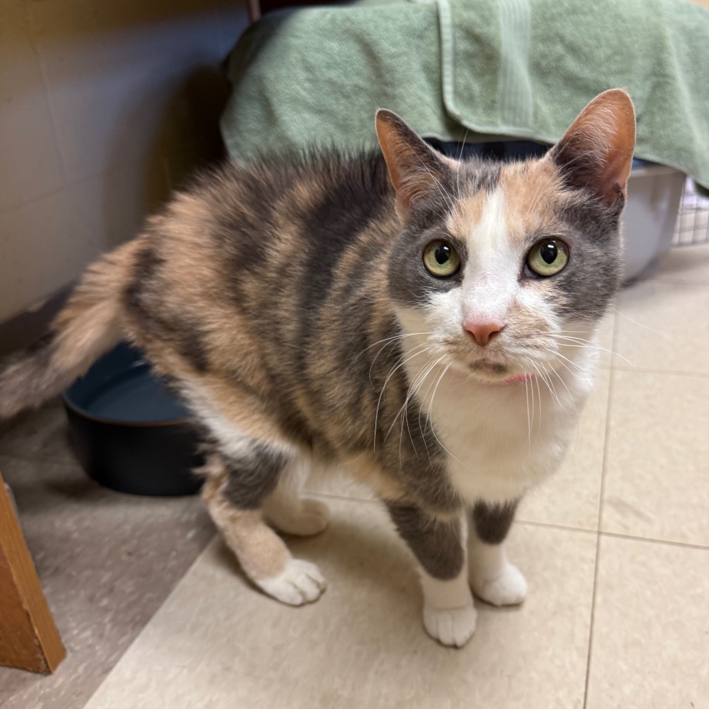 Harmony is a lovely 13-year-old buff calico with a personality as warm and colorful as her coat. This distinguished lady knows exactly what she likes—and she isn’t shy about it. She enjoys petting herself by weaving gracefully around your legs, accepting a few gentle head scritches before settling in on a tall cat tree for an afternoon nap, sometimes even tucking herself beneath a blanket as if making her own little sanctuary. Harmony delights in quiet conversations, the flick of a wand toy, and especially in her treasured treats of sardines in water or Churu. Having never lived with other cats and politely declining the company of dogs, she’s searching for a calm, relaxing home where her steady, confident presence can shine—an easygoing place where a cat with a big heart and a bigger personality can truly feel at peace.