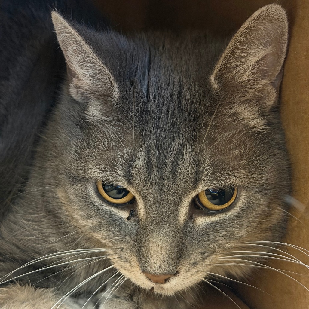 Dawn is a petite grey tabby with a heart made for quiet moments, a six-year-old gal who prefers peace over bustle and patience over hurry. She tucks herself into cozy corners and covered beds for dreamy naps, rising only when the world feels calm and kind. Soft voices and bedtime stories are her favorite lullabies, helping her relax and trust the moment, while tall perches give her a quiet throne from which to survey her kingdom. Add a few bird videos for entertainment, and Dawn will show you that the most beautiful companionship arrives softly, one gentle moment at a time.