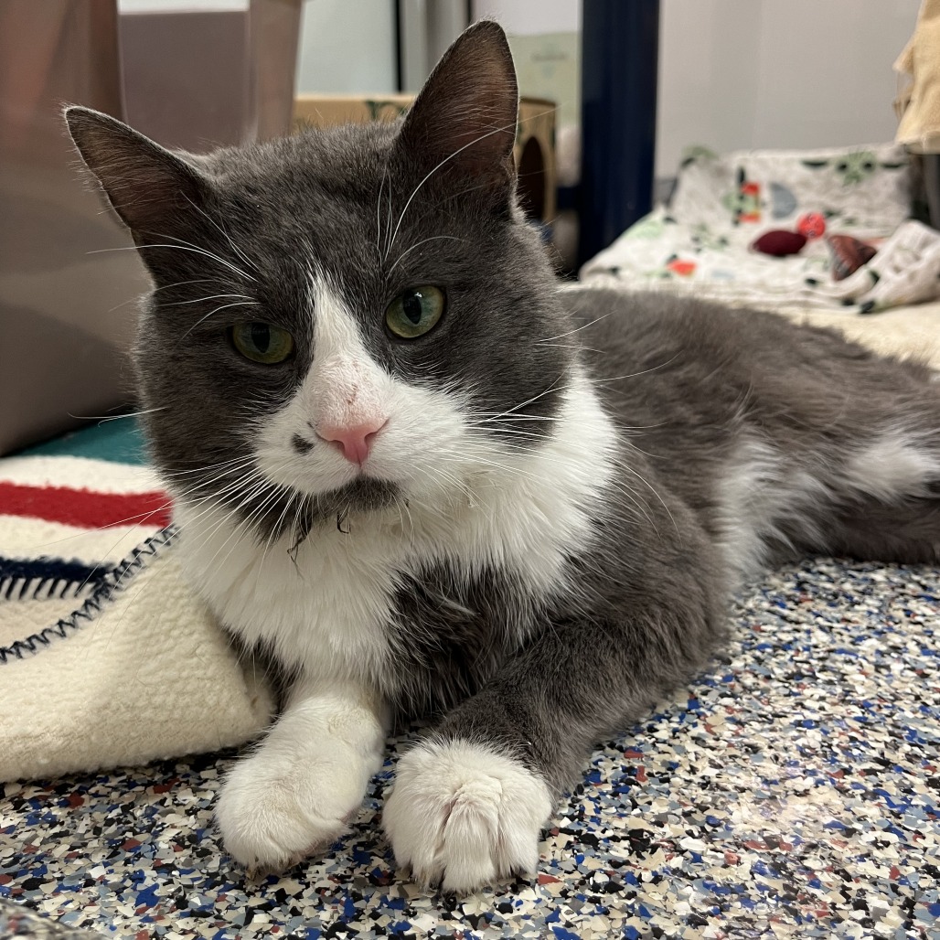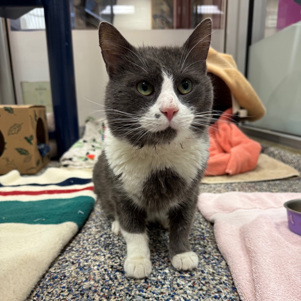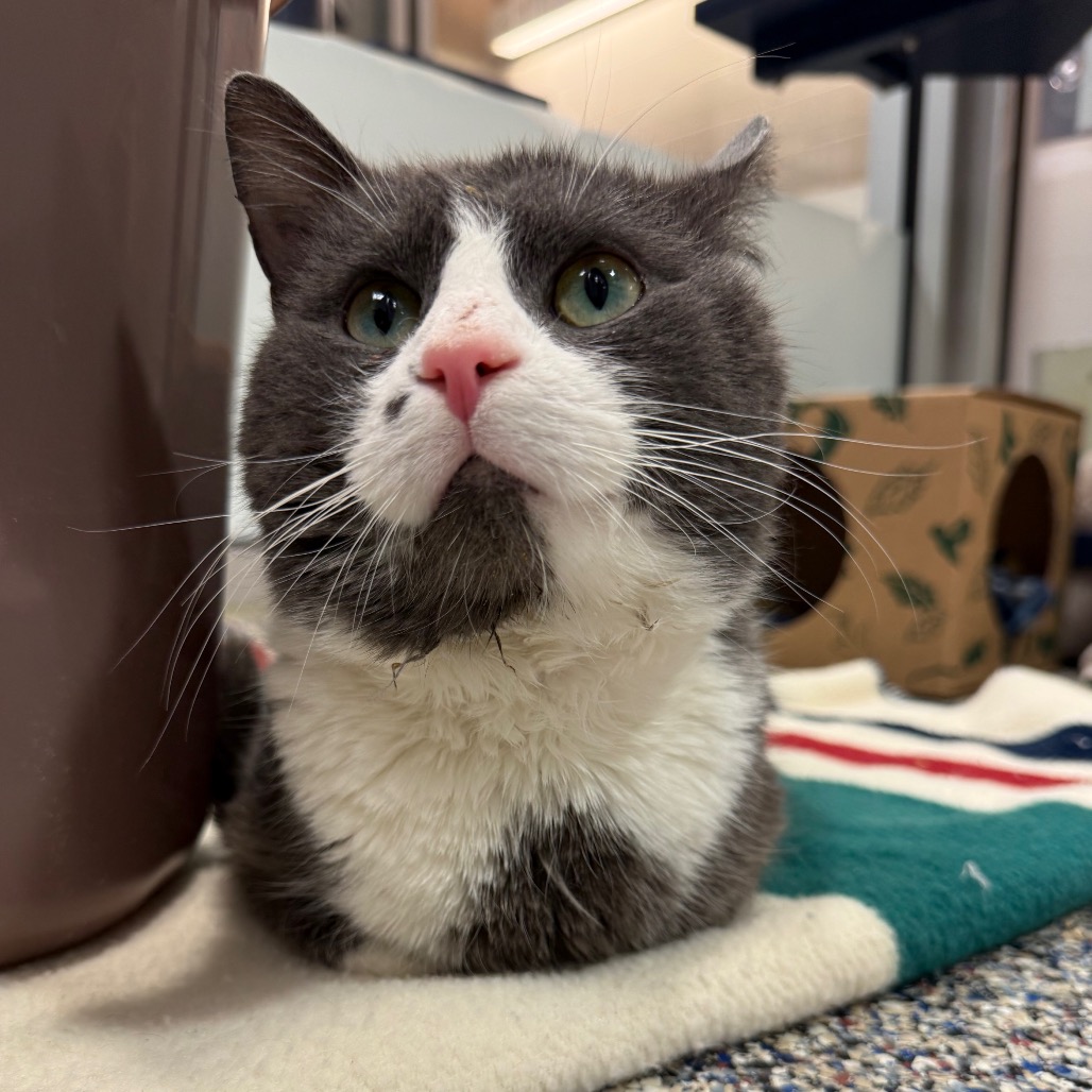 Christopher Robin is a gentle young soul, a 2-year-old grey and white fellow with a charming beauty mark upon his muzzle, as if it were painted there by a careful hand. Once abandoned, he now dreams of a cozy indoor life—one filled with soft beds, kind voices, and the quiet comfort of being truly cherished. True to his storybook name, Christopher Robin has a thoughtful, tender way about him, happiest in calm surroundings where days pass quietly and companionship is soft and steady. He finds happiness in covered beds that feel like little cottages, in catnip toys that bring out a playful spark, and in the simple magic of being spoken to gently, as if sharing small, important thoughts with a trusted friend. Christopher Robin is also feline leukemia positive, which means he will need to live as an indoor-only kitty, either with other FeLV-positive friends or as a beloved only cat—but cats like him can still enjoy many happy, love-filled years, especially when surrounded by good care, warm beds, and gentle hearts. A few tender head scritches are always welcome, and with patience and love, this sweet, shy boy will be a loyal and comforting companion, the sort of friend who makes even ordinary days feel a little more peaceful and bright.