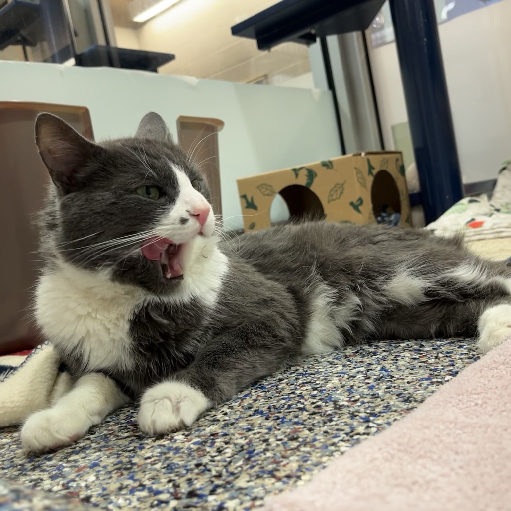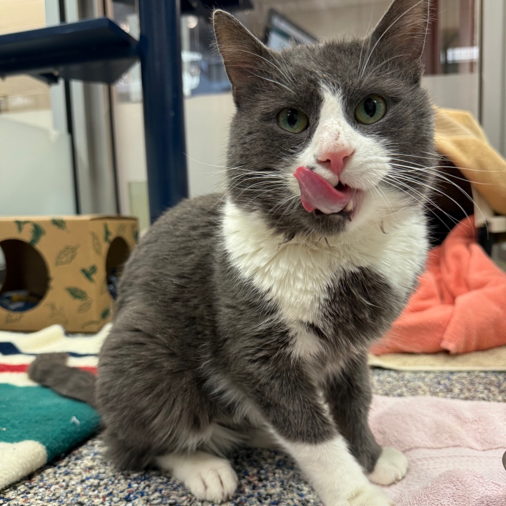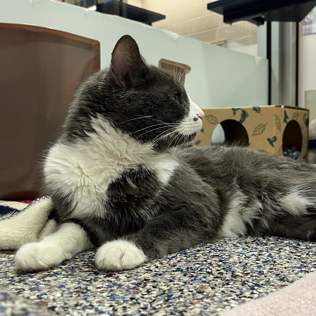 Christopher Robin is a gentle young soul, a 2-year-old grey and white fellow with a charming beauty mark upon his muzzle, as if it were painted there by a careful hand. Once abandoned, he now dreams of a cozy indoor life—one filled with soft beds, kind voices, and the quiet comfort of being truly cherished. True to his storybook name, Christopher Robin has a thoughtful, tender way about him, happiest in calm surroundings where days pass quietly and companionship is soft and steady. He finds happiness in covered beds that feel like little cottages, in catnip toys that bring out a playful spark, and in the simple magic of being spoken to gently, as if sharing small, important thoughts with a trusted friend. Christopher Robin is also feline leukemia positive, which means he will need to live as an indoor-only kitty, either with other FeLV-positive friends or as a beloved only cat—but cats like him can still enjoy many happy, love-filled years, especially when surrounded by good care, warm beds, and gentle hearts. A few tender head scritches are always welcome, and with patience and love, this sweet, shy boy will be a loyal and comforting companion, the sort of friend who makes even ordinary days feel a little more peaceful and bright.