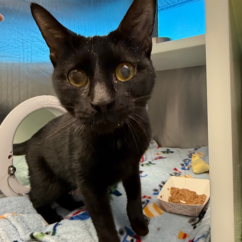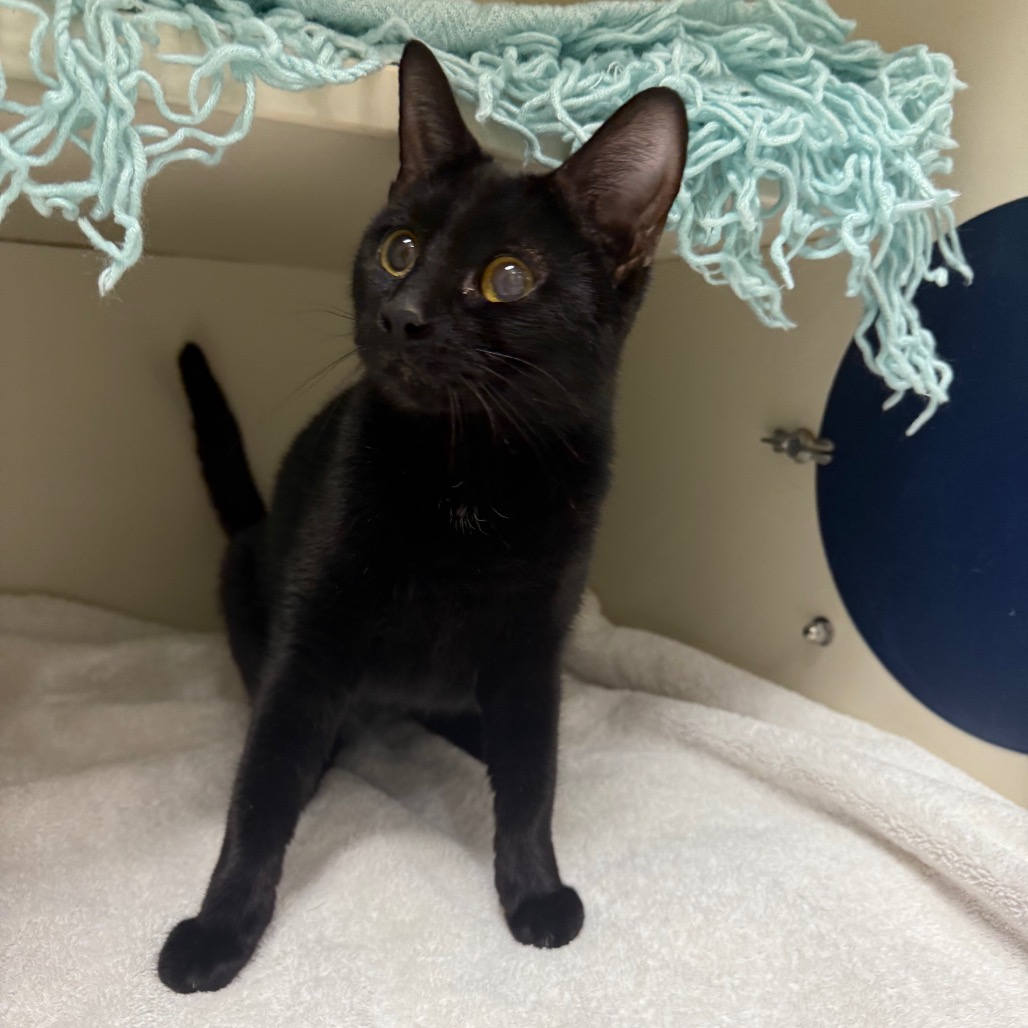 Beans is a petite ebony beauty of three years, a quiet little shadow who seems to carry a bit of calm wherever she goes. She’s a gentle soul who enjoys the soft company of other cats, often choosing a sunny perch or a high resting place where she can nap peacefully and watch the world drift by. Bird-watching is one of her favorite pastimes, and she melts happily into cheek scritches offered with a kind and patient hand. Beans is the sort of companion who doesn’t demand the spotlight but instead brings a soft, steady warmth to a home—a graceful, tenderhearted girl who will quietly weave herself into your days like a beam of afternoon sun.