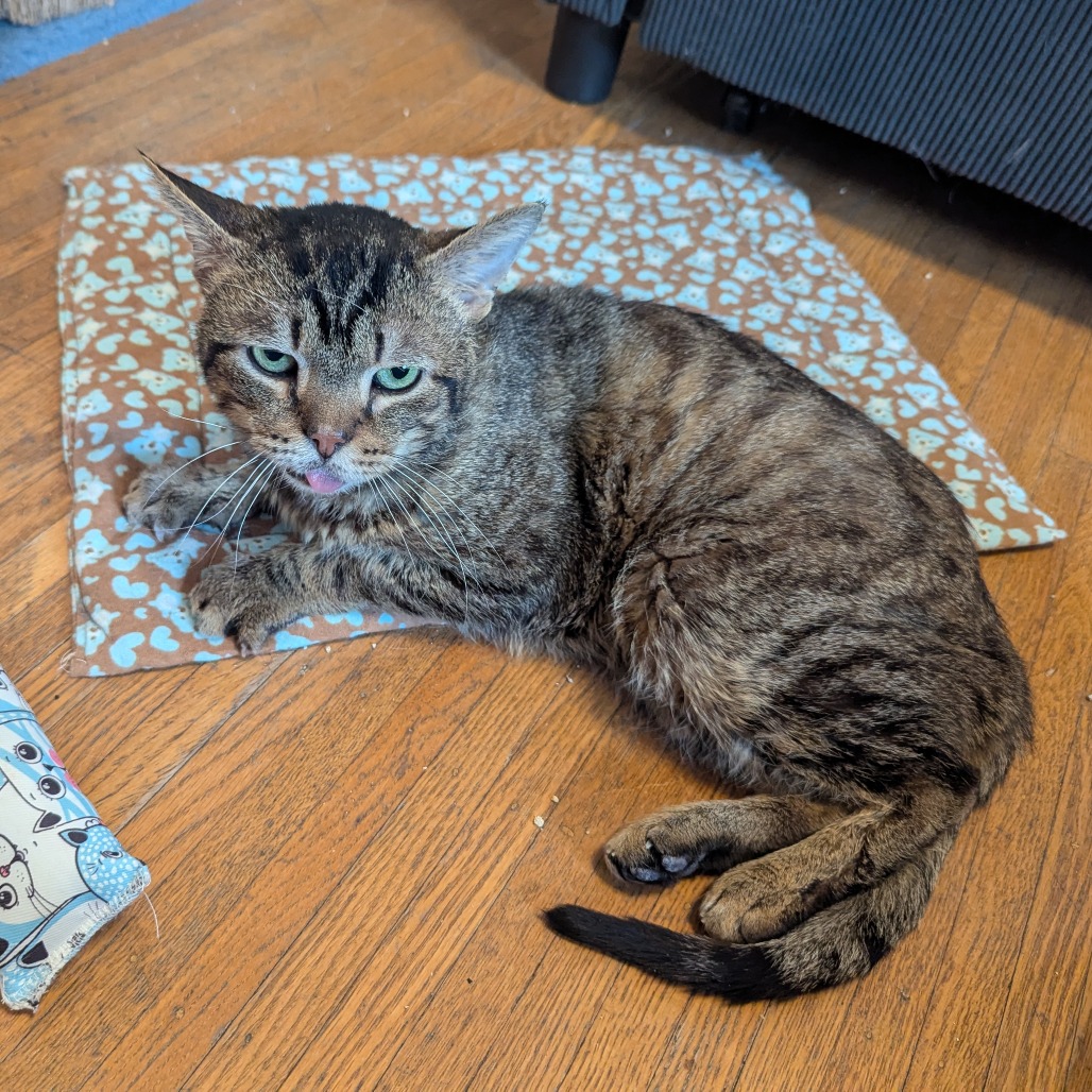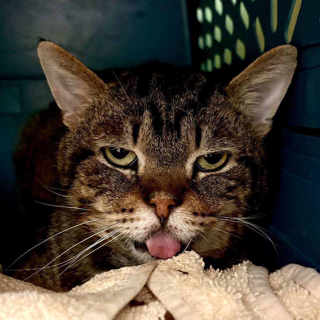 Meet Little Feet, a 5-year-old brown tabby with soulful eyes, a thoughtful brow, and a tiny tongue that peeks out like he’s always pondering the world. He’s a special boy with a heart that thrives in stillness—a quiet home is his sanctuary, chaos his undoing. Gentle whispers, cozy nooks, and a sturdy cat tree are his comforts; bird videos, soft cheek scritches, and a daily Churu treat are his delights. Wet food with just a splash of water is his mealtime ritual, a small act of care that says, “You’re safe here.” He’s not for dogs, not for busy hands—he’s for calm, for patience, for the kind of love that waits. He’ll need a quiet base camp all his own—where his food, water, bed, litter box, toys, and tree are just as he likes them—so he can settle in, at his pace, and begin to trust.