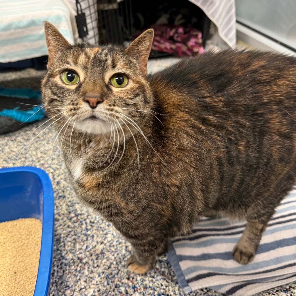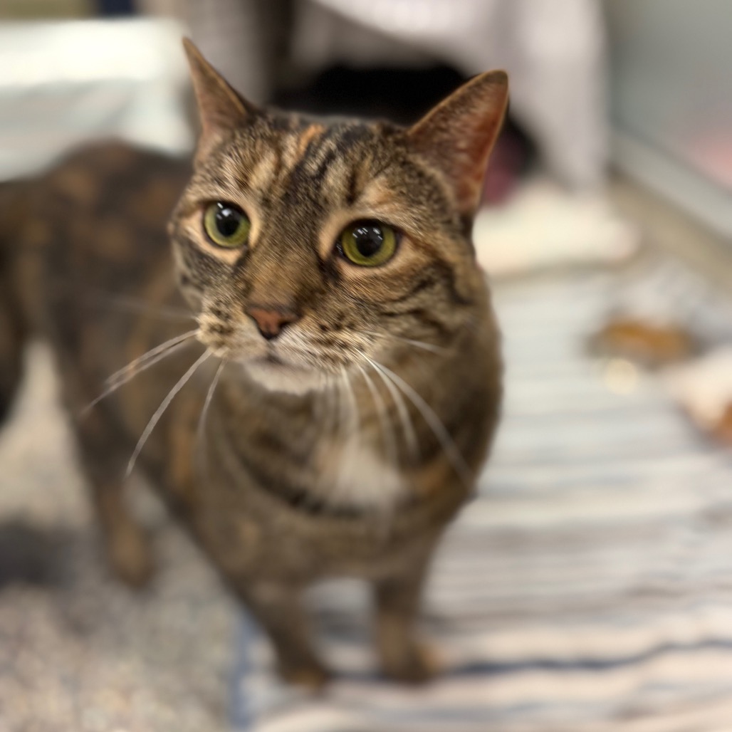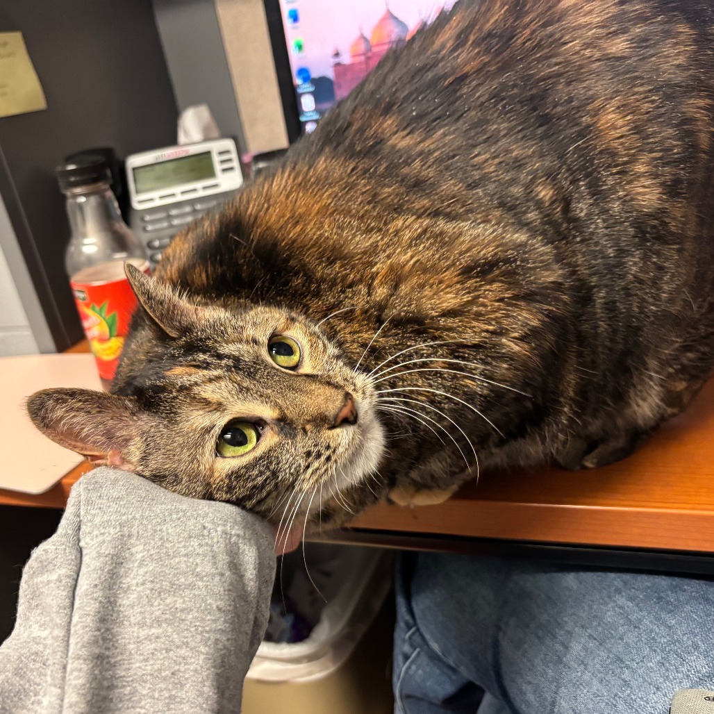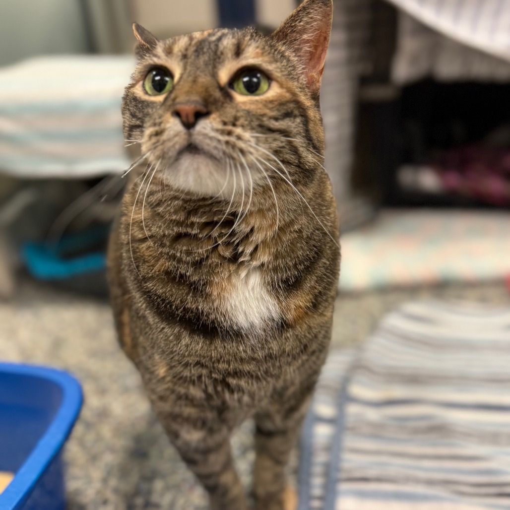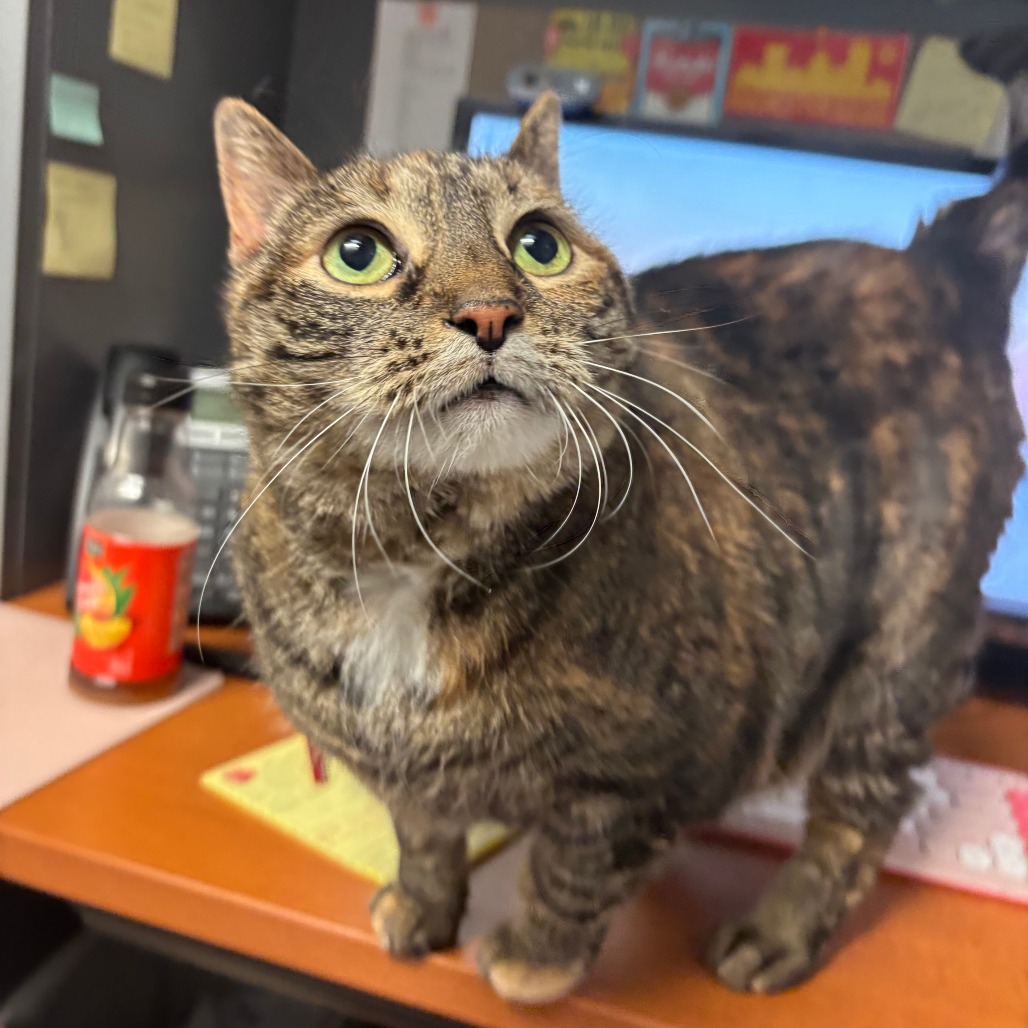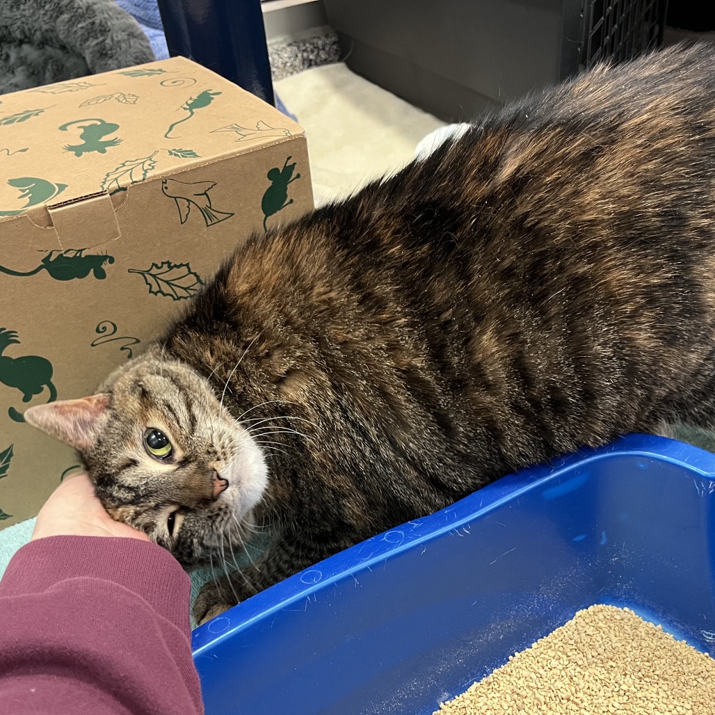 Meet Bubble, an 8-year-old radiant torbie with a spirit as vibrant as her swirling coat and a presence that fills the room at 15 pounds of purring grace. She’s lived peacefully with cats before but says a firm no to dogs—her world is feline, familiar, and just right. She melts for head scritches, savors every bite of wet food, and lives for the bliss of a Churu treat or a wild roll in fresh catnip. She thrives with human company and is convinced she was born to be a lap cat. She will even reach her paw out to you to request more pets! Her cardboard scratcher bears the marks of her joy, and though she gets a little carried away sometimes, her heart is always in the right place—just follow her cues and let her love on her own terms.