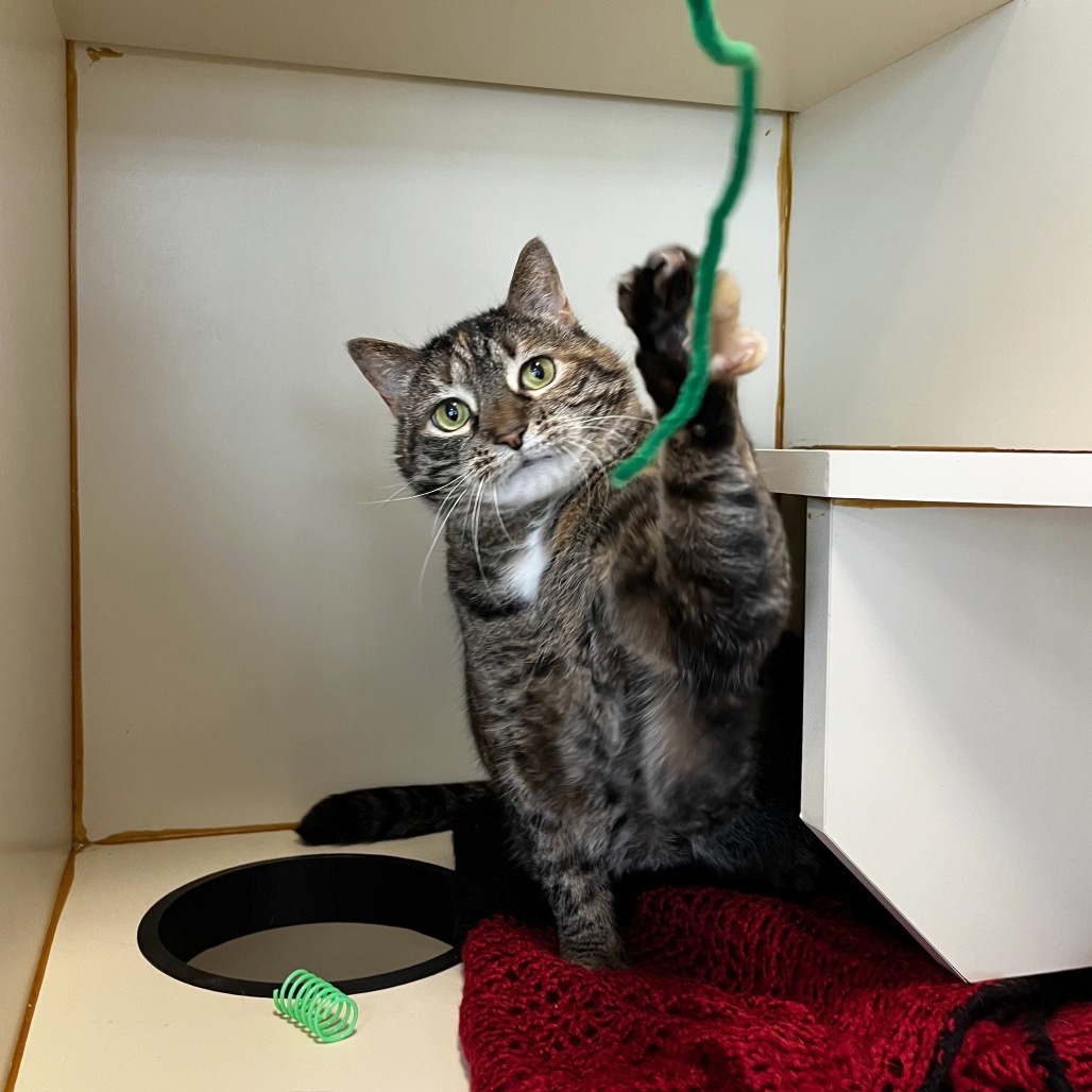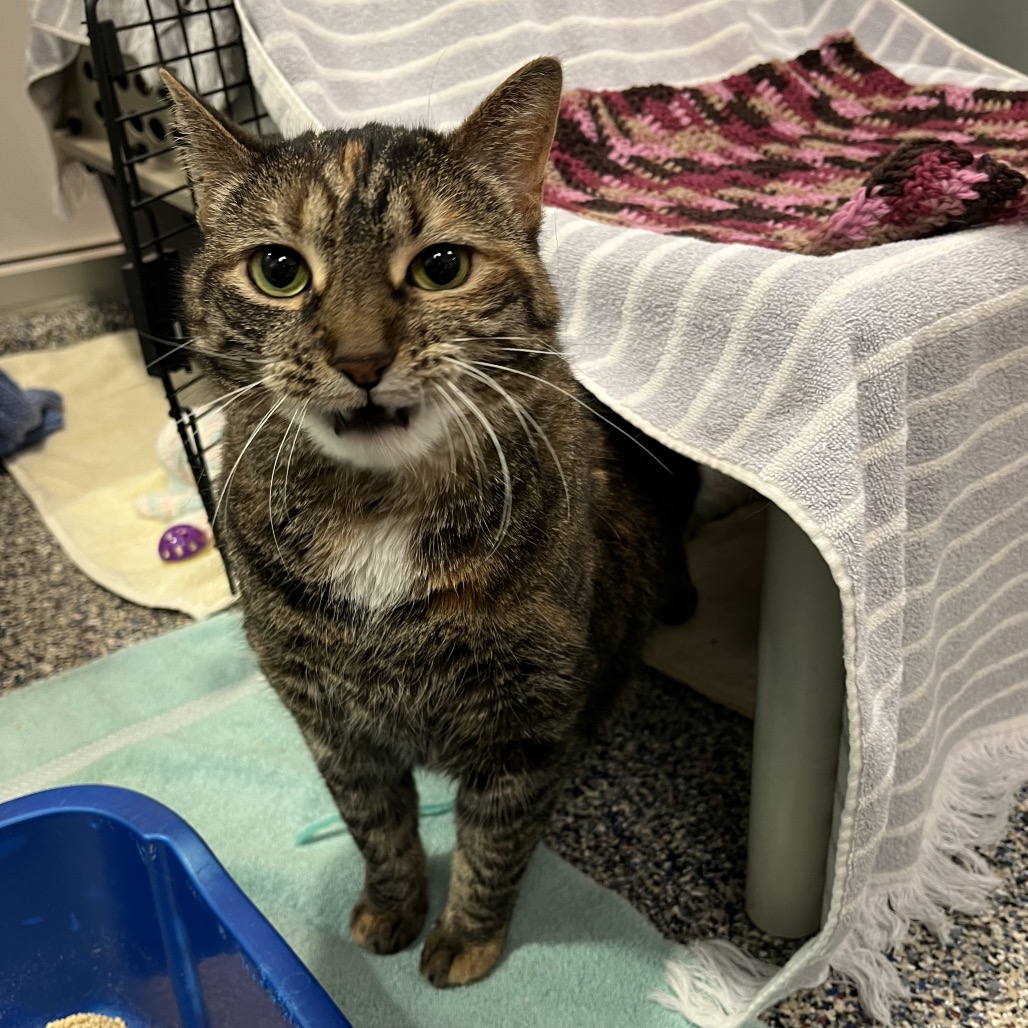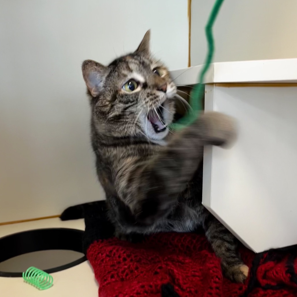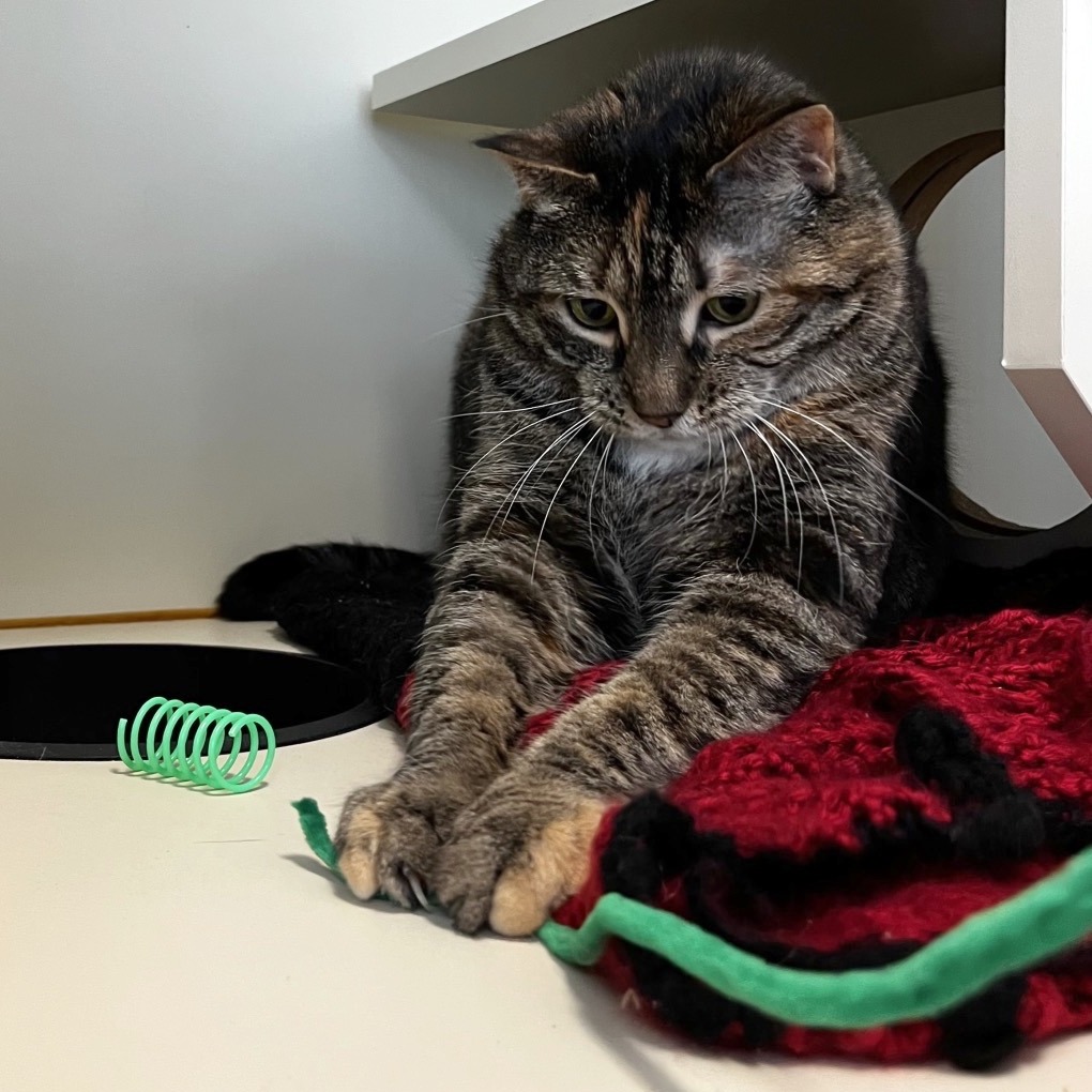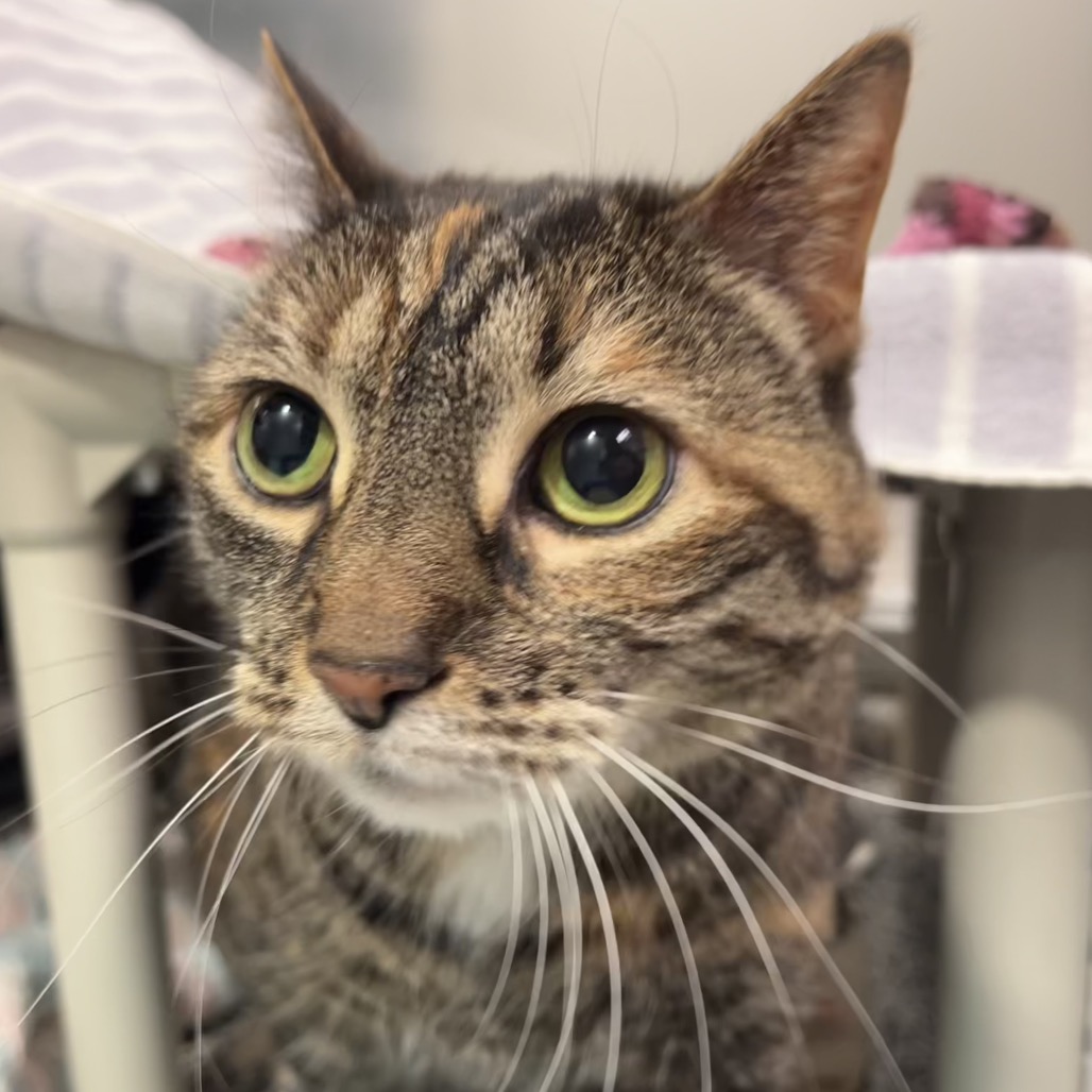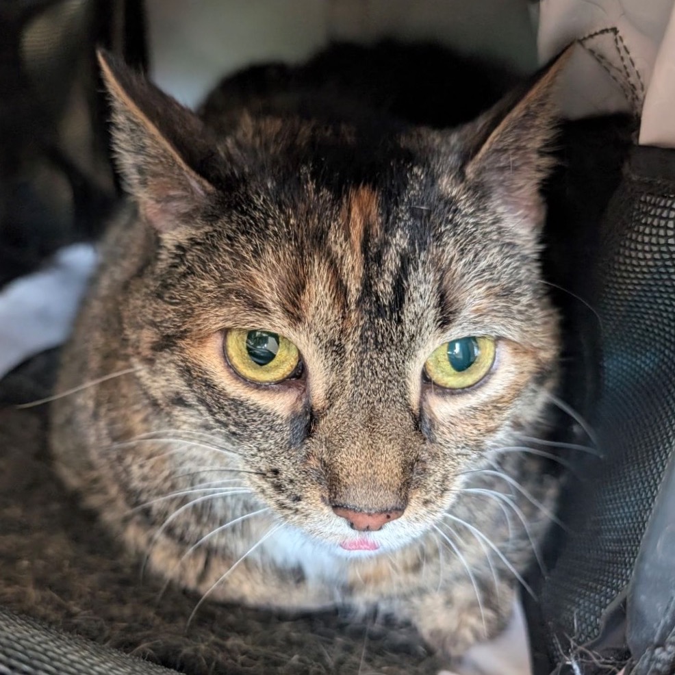 Meet Bubble, an 8-year-old radiant torbie with a spirit as vibrant as her swirling coat and a presence that fills the room at 15 pounds of purring grace. She’s lived peacefully with cats before but says a firm no to dogs—her world is feline, familiar, and just right. She melts for head scritches, savors every bite of wet food, and lives for the bliss of a Churu treat or a wild roll in fresh catnip. She thrives with human company and is convinced she was born to be a lap cat. She will even reach her paw out to you to request more pets! Her cardboard scratcher bears the marks of her joy, and though she gets a little carried away sometimes, her heart is always in the right place—just follow her cues and let her love on her own terms.