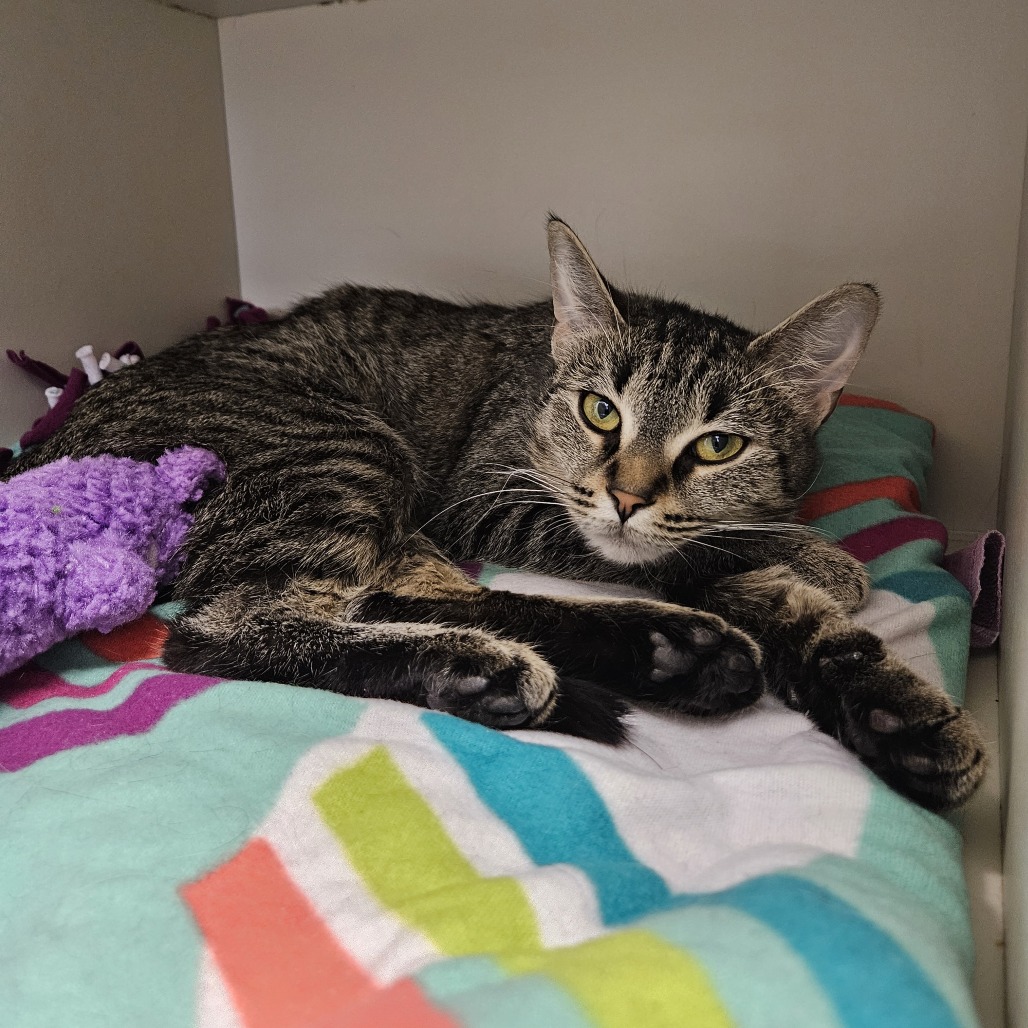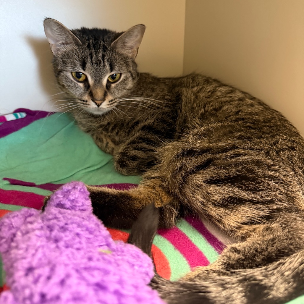 Meet Aang, a 1-year-old brown tabby with a spirit as bright as her eyes and a personality too big for any room. She’s all curiosity, confidence, and clever charm—born to climb, pounce, and own every high perch like a tiny, furry monarch. She loves cozy beds for naps (brief as they are), the thrill of a wand toy chase, and the daily drama of birds passing by her window kingdom. Treats? Oh, she’s very much aware of their power. This little firecracker thrives with someone who speaks fluent cat—someone who can keep up with her energy, match her mischief, and give her space to shine. In the right home, she won’t just live—she’ll soar.