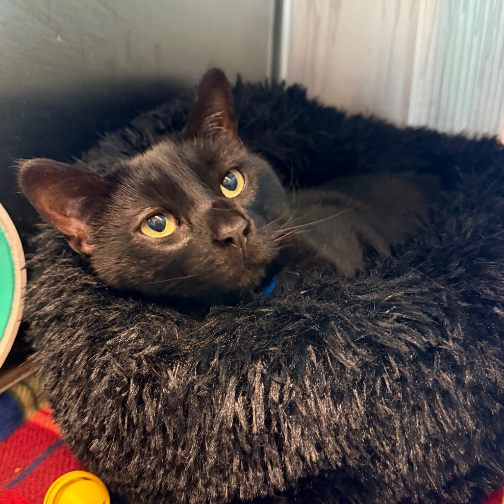 Cassini is a sweet 5-year-old ebony boy with a calm, gentle nature that shines brightest in a quiet home. He loves curling up in fluffy beds for long, peaceful naps, soaking up soft head scritches, and listening contentedly as he’s read to in hushed, soothing tones. Cat trees are a favorite for both scratching and perching, giving him the perfect place to relax and observe his world. Though it’s been a few years since he’s lived with other cats, he carries himself with an easygoing grace, making Cassini a lovely companion for someone who treasures softness, calm moments, and quiet connection.