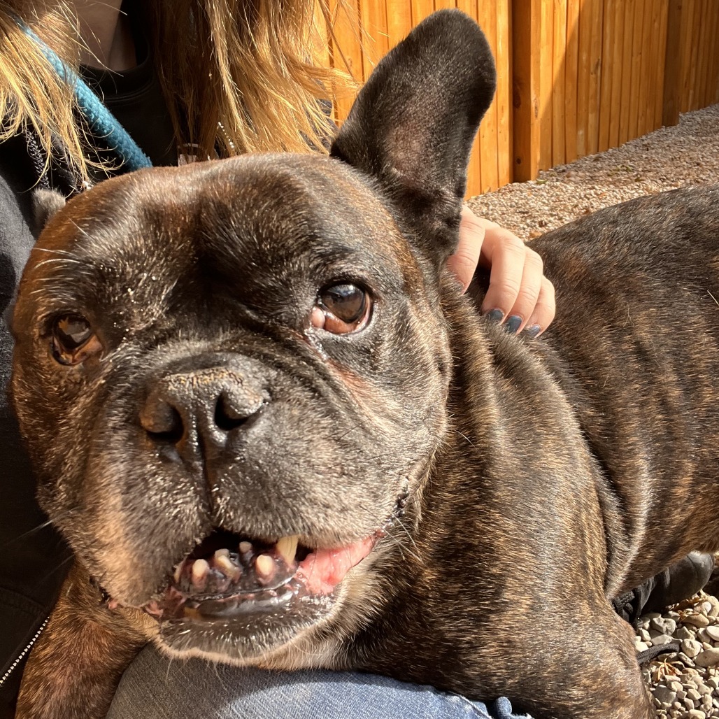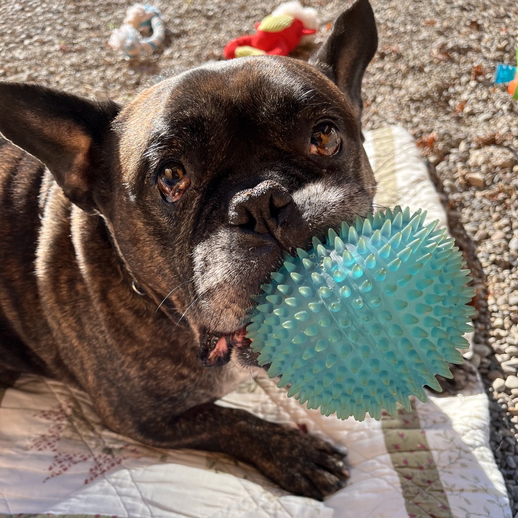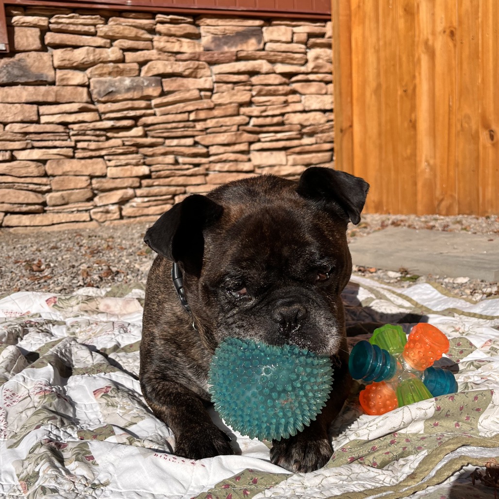 If teddy bears aren't cutting it anymore, we've got a better Bear for you to cuddle! Bear is a 61 lb French Bulldog mix with big adorable ears. He's unfortunately had to have multiple eye surgeries while staying with us at the shelter, but he can see so much better now! Bear loves spending time around people, and will happily show off his squeaky toys to his human friends. This silly boy will give you tons of wiggles while asking for pets! He also is a great walking companion. One of the greatest qualities about this squat man is that he can likely thrive in almost any home. He has a great history with both dogs and cats! We are optimistic that he would be fine around older children, as long as they understand that he doesn't like to share his toys. One of his favorite things in life after all is toys, but he is very good at trading! Bear simply can't bear another day without you. Please consider giving him a home! You can reach out to his agent Hannah at hhecht@lollypop.org to arrange a meeting.